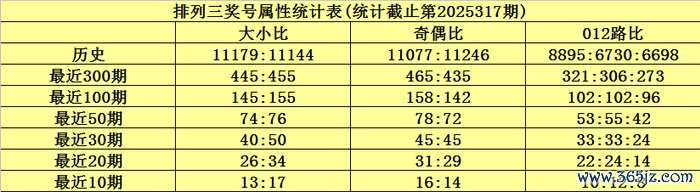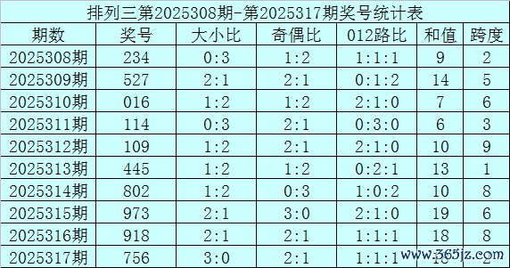 上期回来:陈列三第2025317期奖号为756,奖号012路比为1:1:1,奇偶比为2:1,大小比为3:0,和值为18,跨度为2。