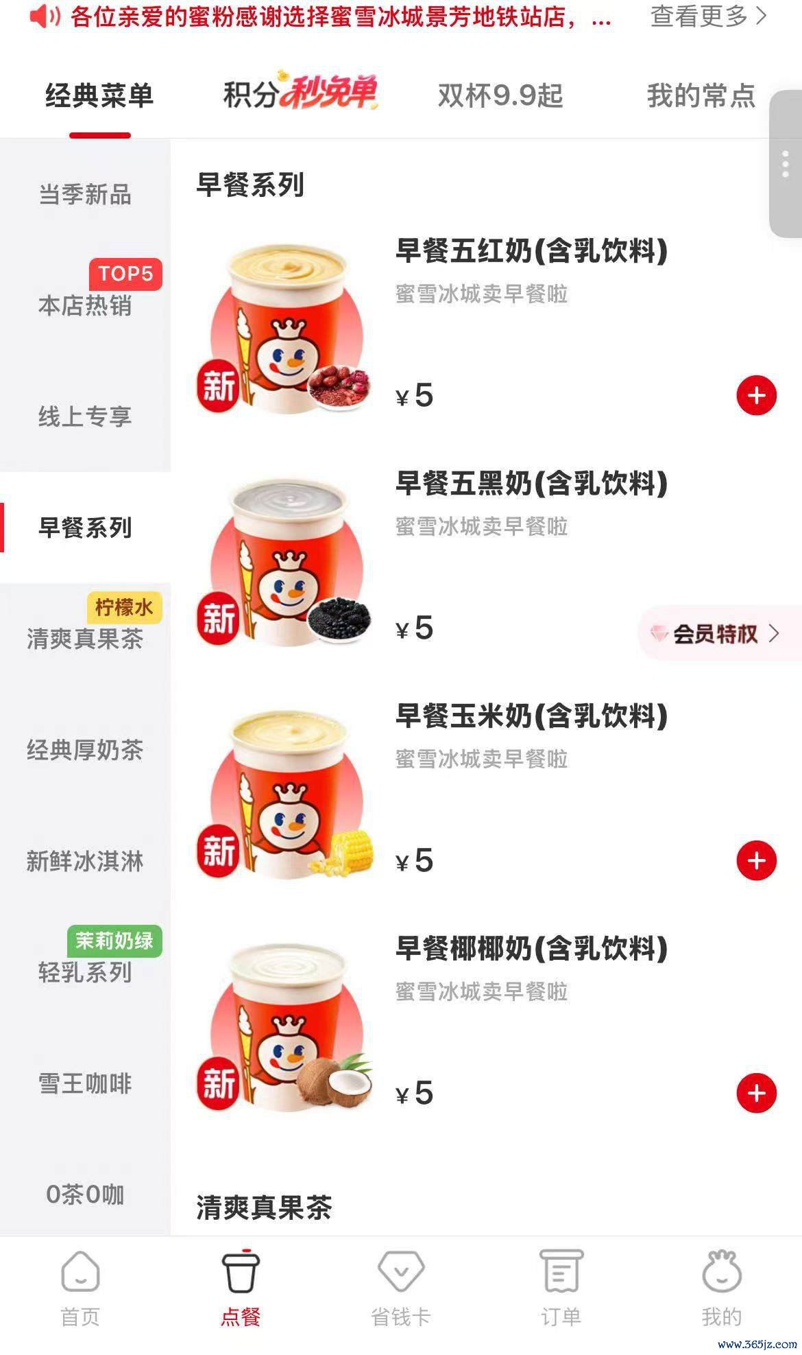 连接此前的价钱计策,蜜雪冰城的早餐品类依旧走的是平价路子。蓝鲸新闻查询已设有“早餐系列”的蜜雪冰城门店菜单发现,当今在售四款早餐奶单价均为5元。此外还有三款面包单价2.9元。早餐奶+面包的套餐价为7.9元。